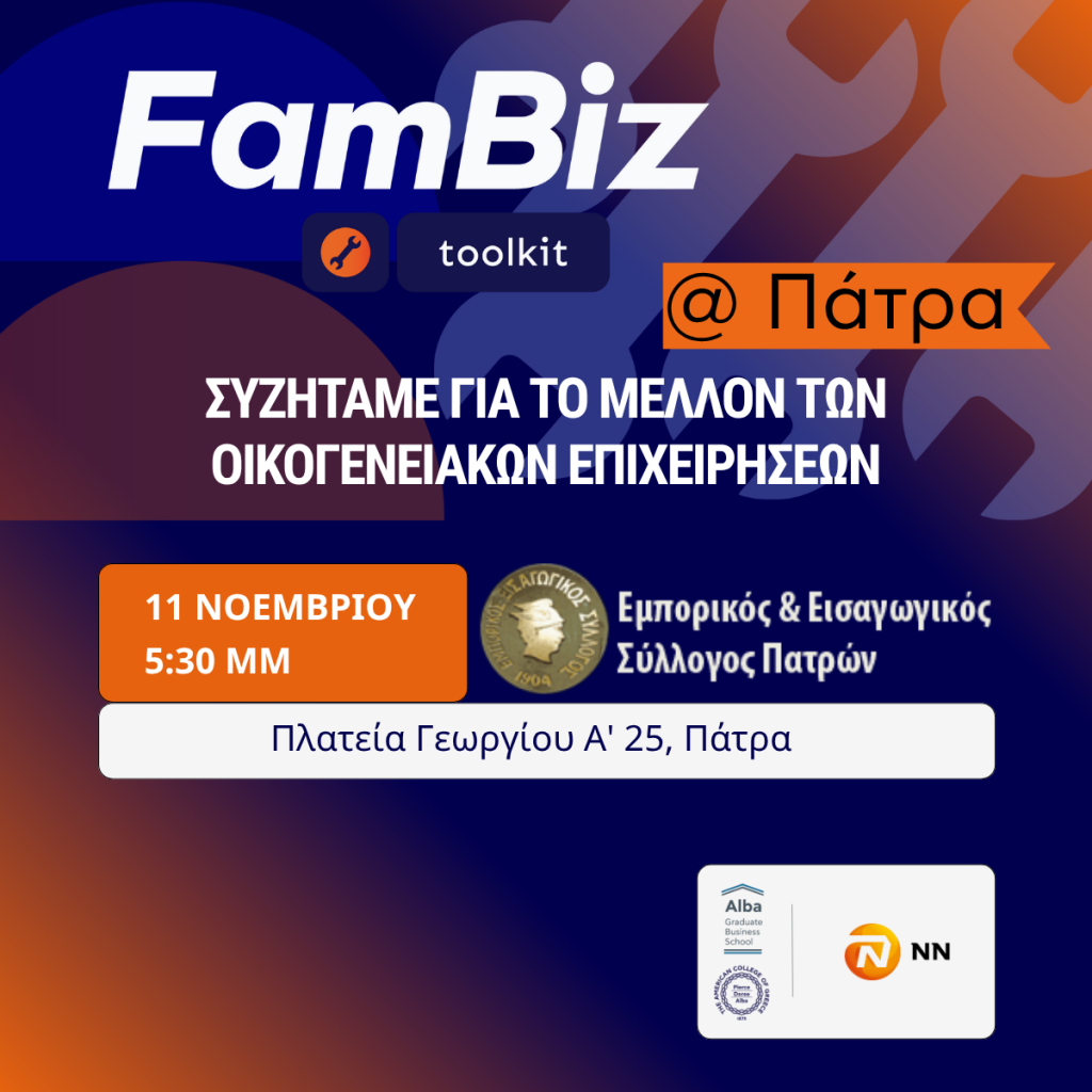 Στο πλαίσιο της επιτυχημένης πρωτοβουλίας FamBiz Toolkit, η NN Hellas και το Alba Graduate Business School, The American College of Greece, ανακοινώνουν την πρώτη τους εκδήλωση εκτός Αθηνών, με τίτλο «FamBiz Toolkit @ Πάτρα: Συζητάμε για το μέλλον των οικογενειακών επιχειρήσεων». Η εκδήλωση, που σηματοδοτεί την επέκταση του προγράμματος σε πόλεις της περιφέρειας, θα πραγματοποιηθεί την Τρίτη 11 Νοεμβρίου 2025, στις 17:30, στον χώρο του Εμπορικού και Εισαγωγικού Συλλόγου Πατρών.