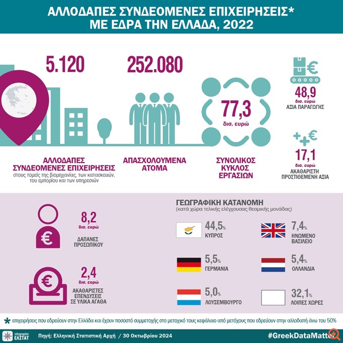 Συνολικά 5.120 αλλοδαπές συνδεόμενες επιχειρήσεις δραστηριοποιήθηκαν το 2022 στην Ελλάδα στους τομείς της βιομηχανίας, των κατασκευών, του εμπορίου και των υπηρεσιών, σύμφωνα με τα αποτελέσματα έρευνας της ΕΛΣΤΑΤ.