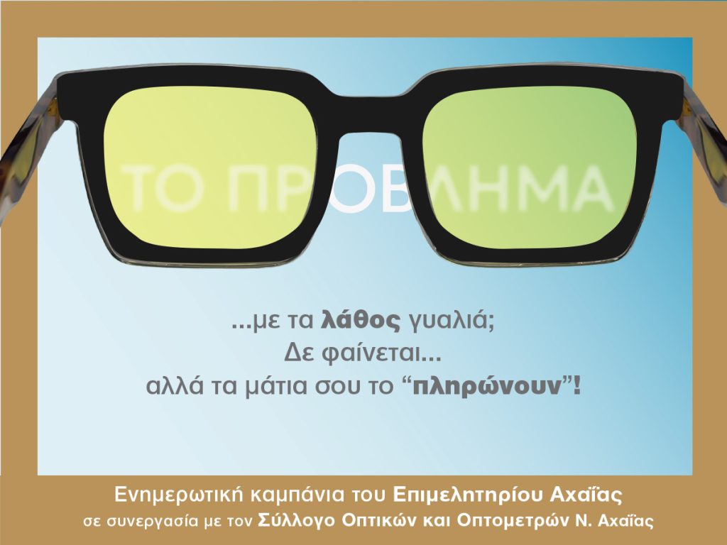 Το Επιμελητήριο Αχαΐας, στο πλαίσιο της επικοινωνιακής στρατηγικής «Το Επιμελητήριό σου, η Δύναμή σου», υλοποιεί μια νέα ενημερωτική καμπάνια για την προστασία της υγείας των ματιών και την υπεύθυνη αγορά οπτικών ειδών, σε συνεργασία με τον Σύλλογο Οπτικών και Οπτομετρών Αχαΐας.