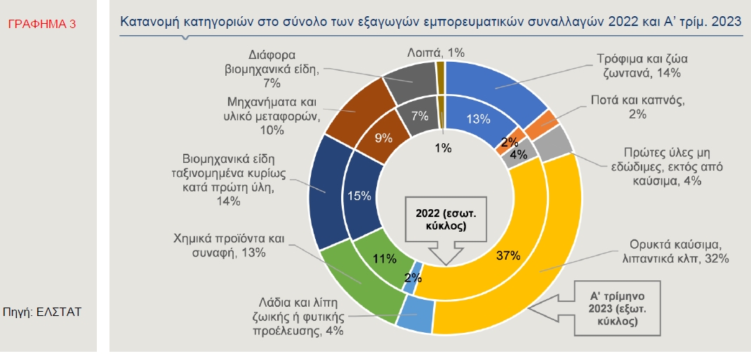 Το πρώτο τρίμηνο του 2023, διατηρήθηκε η ανοδική τάση σε όλες τις κατηγορίες με εξαίρεση τις πρώτες ύλες και τα λοιπά είδη (είδη και συναλλαγές μη ταξινομημένα κατά κατηγορίες). Τη μεγαλύτερη αύξηση κατέγραψαν τα λάδια και λίπη ζωικής ή φυτικής προέλευσης και ακολούθησαν τα ποτά και ο καπνός και τα ορυκτά καύσιμα, λιπαντικά. Αξίζει, ωστόσο, να σημειωθεί ότι το μερίδιο της τελευταίας κατηγορίας παρουσιάζεται ελαφρώς μειωμένο στο 32% (Γράφημα 3), γεγονός που συνάδει με την αποκλιμάκωση των τιμών της ενέργειας τους πρώτους μήνες του τρέχοντος έτους. Ο εν λόγω παράγοντας συντέλεσε, σε κάποιο βαθμό, και στη μείωση του εμπορικού ισοζυγίου, το πρώτο τρίμηνο του 2023, κατά 19%, με τις εισαγωγές να έχουν αυξηθεί σημαντικά ηπιότερα (1,8%) από τις εξαγωγές. Τέλος, όπως και το 2022, το πρώτο τρίμηνο του 2023 οι εξαγωγές προς τα κράτη-μέλη της Ευρωπαϊκής Ένωσης (+22,9% σε ετήσια βάση) υπερέβησαν τις εξαγωγές σε τρίτες χώρες (+11,4% σε ετήσια βάση).