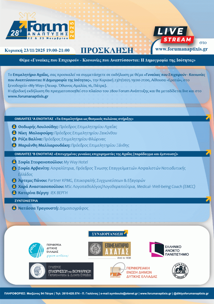 Το Επιμελητήριο Αχαΐας συμμετέχει ενεργά στο 28ο Forum Ανάπτυξης ανοίγοντας μια συζήτηση που αφορά όχι μόνο το παρόν, αλλά και το μέλλον της κοινωνίας και της οικονομίας. Με τη συνεδρία «Γυναίκες που Επιχειρούν – Κοινωνίες που Αναπτύσσονται: Η Δημογραφία της Ισότητας», η νέα Επιτροπή Γυναικείας Επιχειρηματικότητας του Επιμελητηρίου πραγματοποιεί την πρώτη της δημόσια δράση, φέρνοντας στο επίκεντρο τη σχέση μεταξύ επιχειρηματικότητας, ισότητας και δημογραφικής βιωσιμότητας.