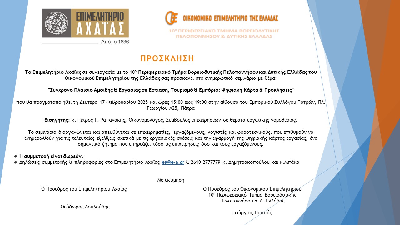 Το Επιμελητήριο Αχαΐας σε συνεργασία με το 10ο Περιφερειακό Τμήμα Βορειοδυτικής Πελοποννήσου και Δυτικής Ελλάδας του Οικονομικού Επιμελητηρίου της Ελλάδας σας προσκαλεί στο ενημερωτικό σεμινάριο με θέμα: